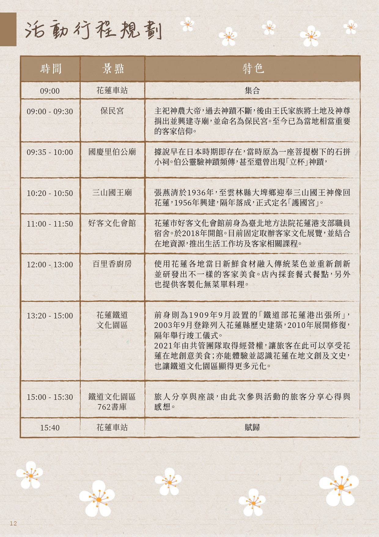 走訪花蓮市,探索客家人在此的足跡,根據花蓮市客家處民國110年(2021)調查,花蓮市目前全市人數約十萬人左右,但客家人口約三萬五千餘人。除了原有的客家祭祀文化外,客家美食也隨著族群的遷移而蓬勃發展,百里香廚房李師傅來自屏東萬巒,善用花蓮當地新鮮食材結合客家傳統元素,創造出一道又一道既傳統又創新的客家美食。有個流傳在客家人社群的玩笑話,過去尚未電腦連線的年代,返鄉買車票一定要說客家話。早年,有許多客家子弟透過鐵道部的招募進入鐵路局工作,在民國60年代政府推行禁說方言,大家說華語不說母語,但往往在返鄉購票時無心的一句客語,讓彼此感受到了莫名的親切感,無論如何一定要幫自己人生出一張有座位的車票。花蓮鐵道文化園區在民國70年代裁撤後,再經歷文史團隊與花蓮縣文化局共同的搶救與整修,至今仍保持相當多當年的辦公廳舍與歷史文物。透過預約導覽方式,便能夠尋找當年隱藏在鐵路局裡的客家精神。建議您能以單車或機車的方式,漫遊在花蓮市區來場「城市尋客」巡禮。