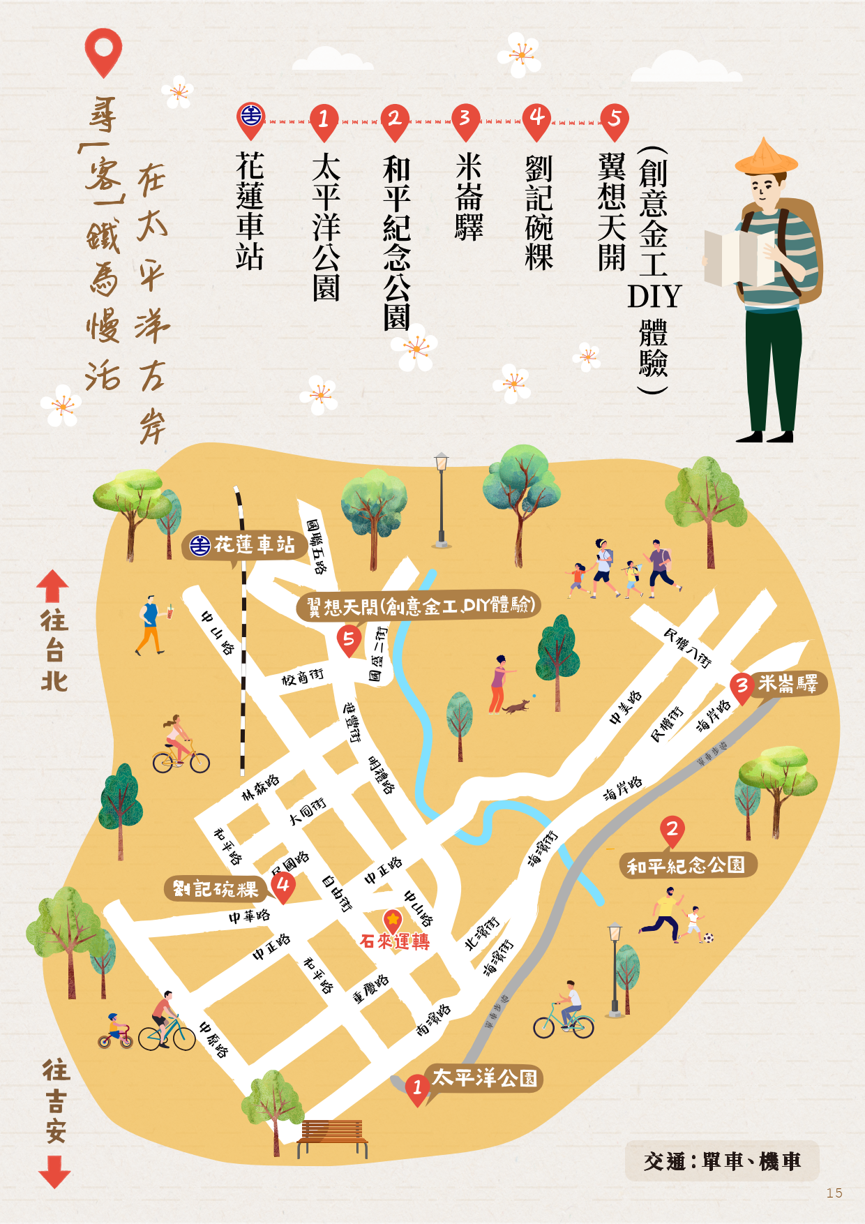 百年前的花蓮,客家先民、日本移民等不同族群自花蓮南濱舊港登岸展開人生的新旅程。走訪花蓮您也可以把腳步放慢,騎著鐵馬悠閒在昔日臨港線鐵道之濱海自行車道上;也可穿梭在花蓮市巷弄中探尋客籍藝術家與廚師創意與保留客家元素的組合。昔日花蓮中學學生上下學搭乘的臨港線鐵道,原為日本時期為了方便貨物運輸而開設的鐵道,後為了服務美崙地區鄉親進城的便利性,於是也開啟了客運的服務,一直到民國70年代才終止了臨港線鐵道的運輸服務。如今成了最受花蓮鄉親喜愛的運動場所,騎乘單車或是走在鋪設柏油路面的舊鐵軌路基上。