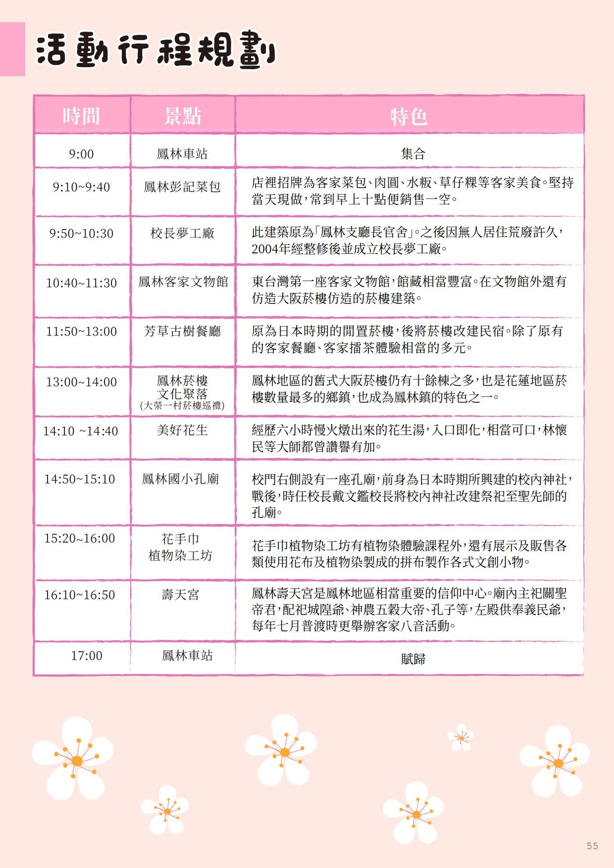 另外客家主題館舍也是東臺灣獨有,例如:鳳林國小的校內孔廟,前身是日本時期的校內神社,戰後首任校長戴文鑑先生改為孔子廟;鳳林當地的信仰中心壽天宮內側殿也祀有孔子像,由此可見鳳林當地對於教育的重視。另外,日本時期鳳林支廳長官舍改造並活化的「校長夢工廠」,也見證了客家人天性勤儉樸實重視教育的精神,據館方統計資料,全臺鳳林客庄的校長就高達100餘位。