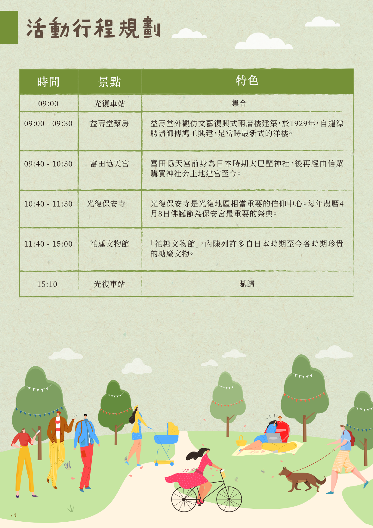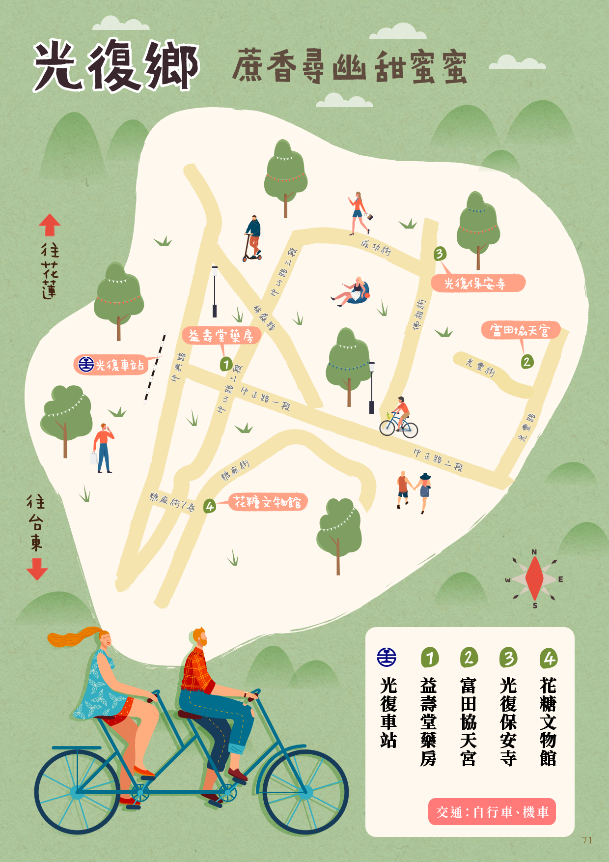 光復鄉阿美族比例較多,但此地漢人也佔有一部分。透過輕旅行的方式,走訪當地重要的兩座漢人寺廟了解這一段過往;來到花蓮糖廠除了吃冰外,也能來趟一日蔗工體驗,體會早年工人忙進忙出的辛酸血淚。在吃冰的當下,別忘了承蒙這些辛苦的勞工朋友們。