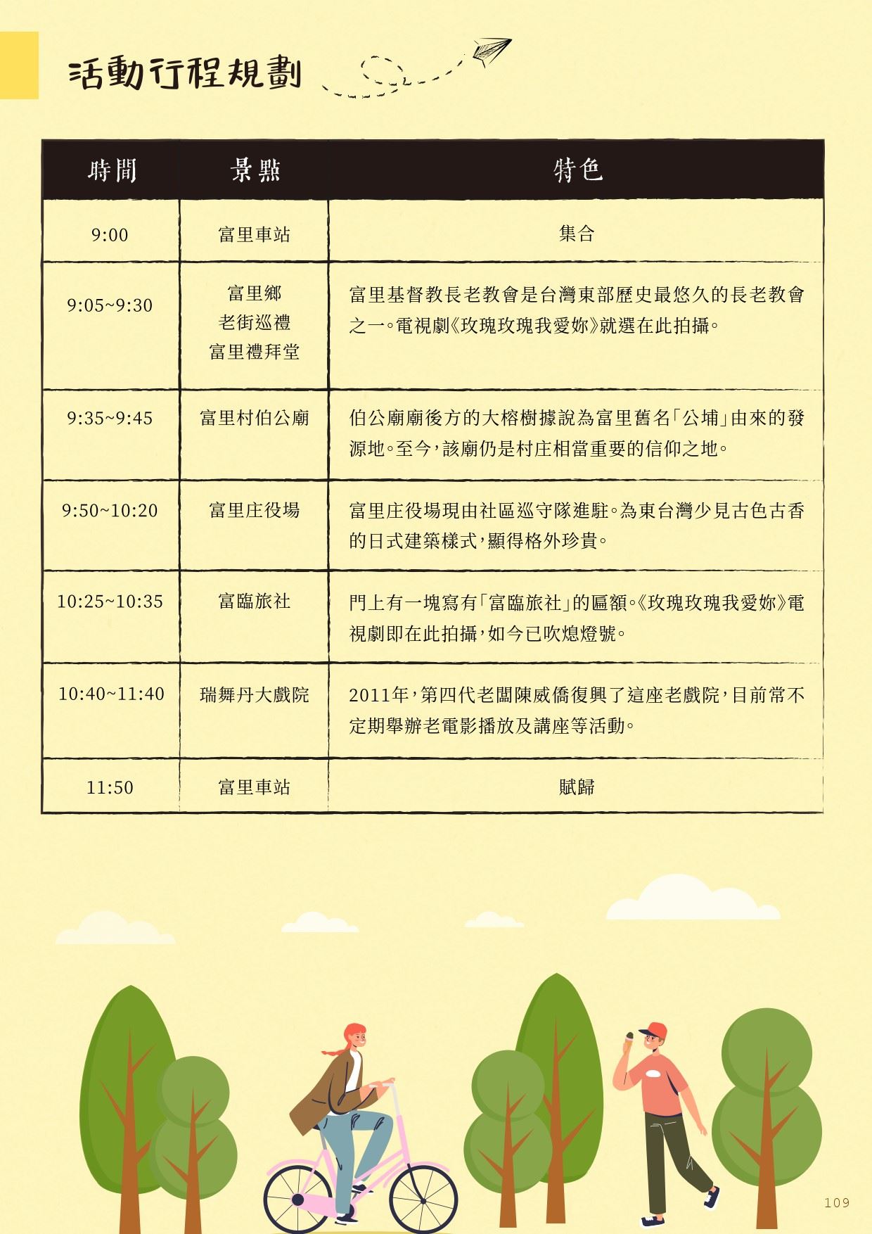 公埔地名發源地之百年大榕樹與伯公廟、懷舊旅社及哥德式教堂與王禎和之約、全臺最美的穀倉車站,自富里車站下車後,沿著街上的方向步行約5分鐘左右即可來到富里小鎮,放慢您的腳步,慢慢地欣賞這座小鎮。